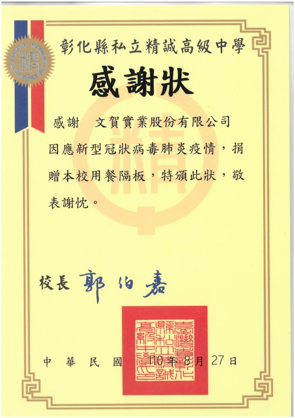 Chairman Lee Hsin-Chieh, to help ease the burden of school epidemic prevention efforts, generously donated 4,000 customized food-grade paper dividers to Jing Cheng High School.