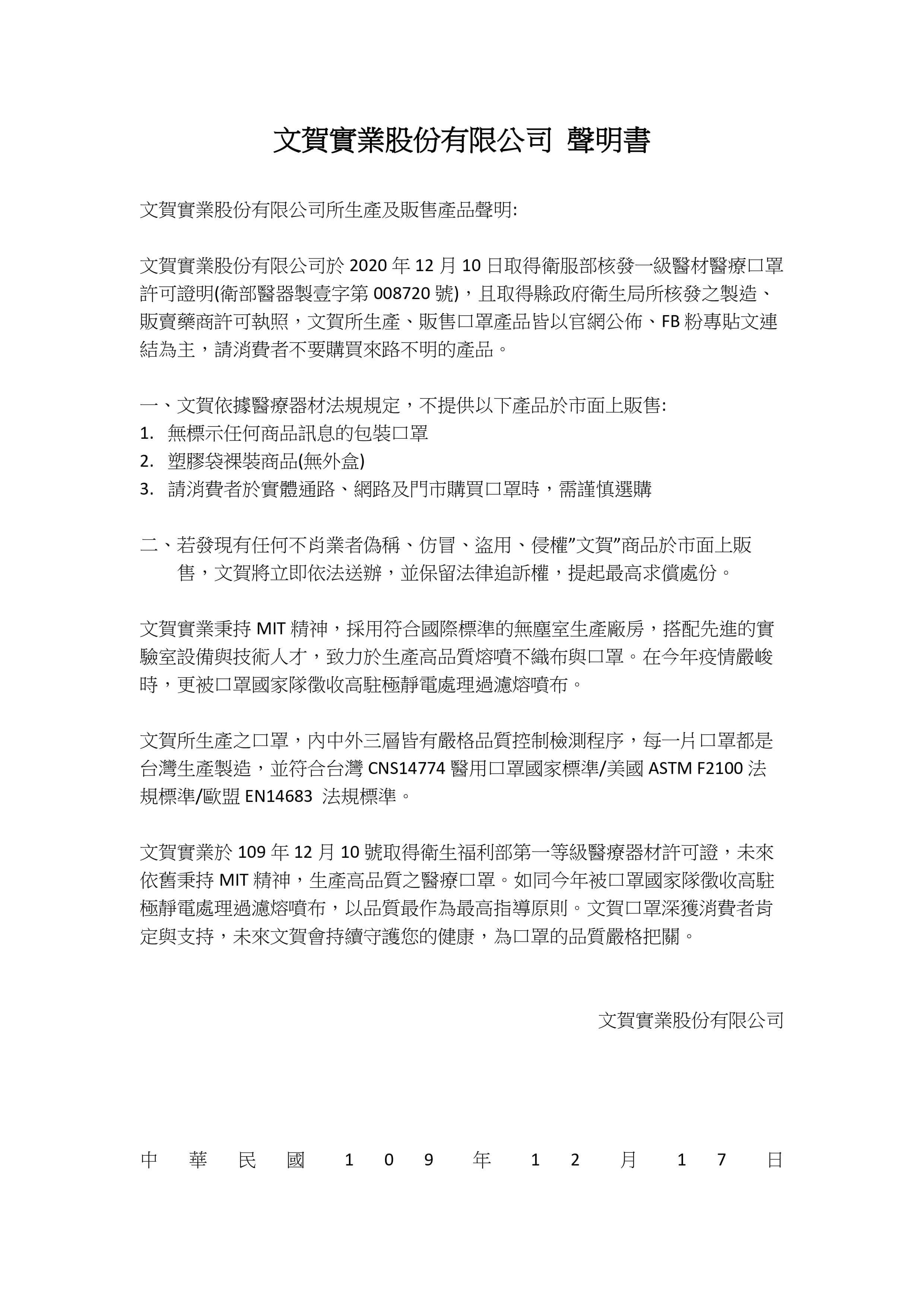 Wen Ho Industrial Co., Ltd. obtained the Class I Medical Device License for medical masks issued by the Ministry of Health and Welfare on December 10, 2020 (License No. 衛部醫器製壹字第008720號). We also hold manufacturing and sales permits issued by the local Health Bureau. All masks produced and sold by Wen Ho are officially announced on our website and Facebook page. Consumers are advised not to purchase products from unknown or unauthorized sources.